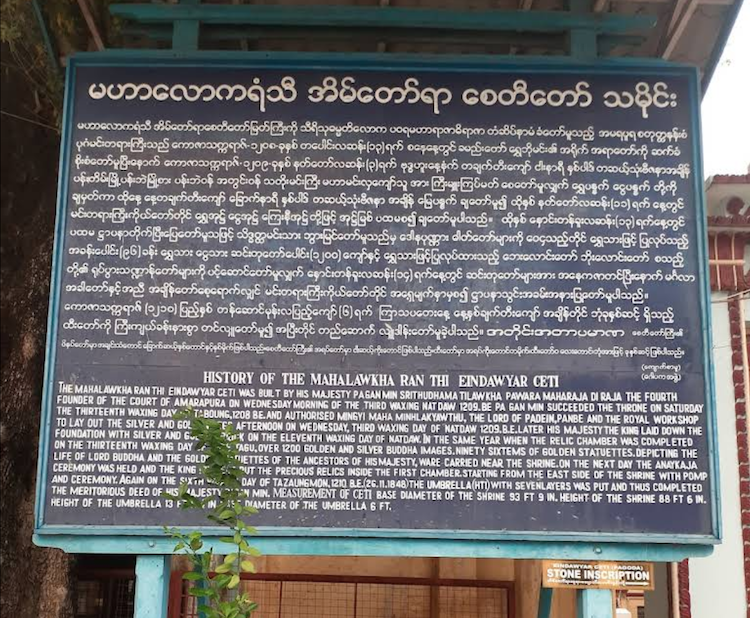 Eain Daw Yar Pagoda is located to the west of Zegyo Market. It was built by King Bagan Min on his accession to the throne and in the memory of Theebaw's only son. Bagan Min was deposed, though spared, following the palace revolution of 1853. He lived out his life in a monastery of this site, eventually dying of smallpox.
