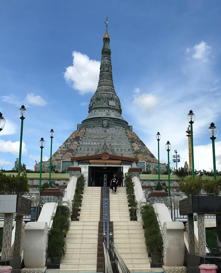 This Jade Pagoda, named 'Werawsana', is the world’s largest jade pagoda. The structure of pagoda is entirely built with jade pieces and slabs which cost US$15 million. It is 75 feet 6 inches in high and 175 feet in circumference and each terrace is 52 feet 6 inches in long and broad and 12 feet in high. 30,000 Jade Buddha statues decorate the outer structure of the pagoda.